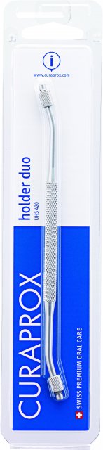 Profesionální držák mezizubních kartáčků z eloxovaného hliníku oboustranný v barvě stříbrné, který je určen pro bezpečné a praktické čištění mezizubních prostor, speciálně vhodný pro postranní úsek zubů. 1ks držáku UHS 420 v balení (blister).