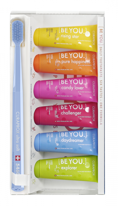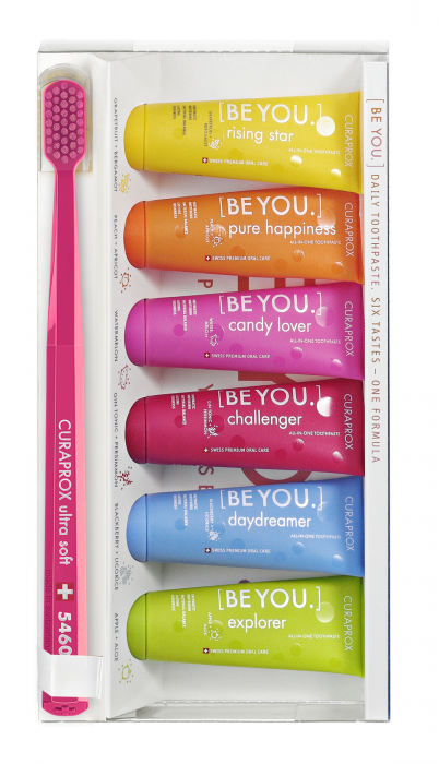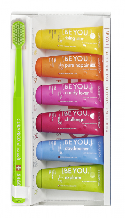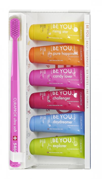 Balení obsahuje 6x mini bělící zubní pastu BE YOU 10 ml a zubní kartáček CS 5460 Ultrasoft.