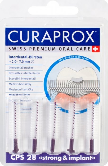 Mezizubní kartáčky "strong implant" jsou vhodné pro zvláštní nároky u implantátů a můstků (plastový potah drátků chrání povrch implantátů). Jsou obzvláště účinné díky srpkovitému ohnutí a bočnímu tlaku. V balení (blister) 5ks mez.kartáčků.