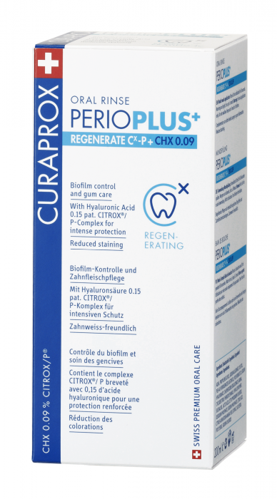 Ústní voda Perio Plus+ Regenerate poskytuje intenzivní péči po operacích v dutině ústní. Kombinuje HA a CHX, které podporují účinnou regeneraci tkání v ústech a zlepšují pooperační výsledky. Urychluje hojení.