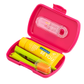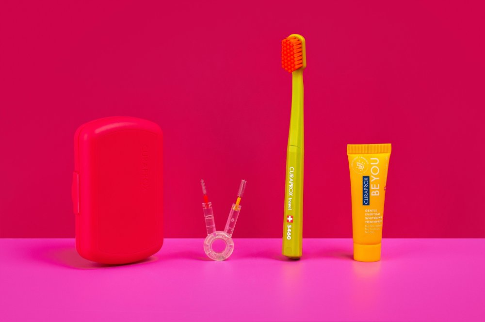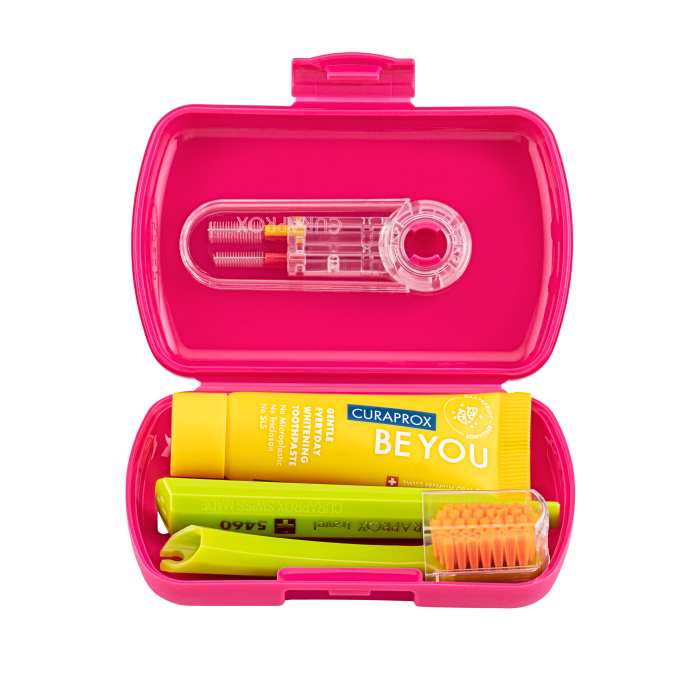 CURAPROX Travel set je nepostradatelným společníkem na cesty. Ať jste kdekoliv, vždy máte připravenou sadu základních pomůcek pro správnou péči o zuby a dásně. Díky praktické velikosti krabičky (pouze 9,5 cm x 6 cm) už nemusíte dělat kompromisy a můžete mít užitečné pomocníky dentální hygieny vždy při sobě, v příručním zavazadle nebo prostě v kapse.