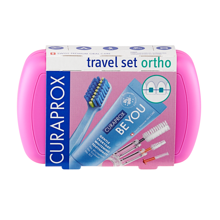 Praktický Ortho Travel Set obsahuje pomůcky prokaždodenní péči o zuby s rovnátky: zubní kartáček ultra-soft CS 5460 Ortho ve skládací verzi, osvěžující bělicí pastu BE YOU, tři různé mezizubní kartáčky ( CPS 07 prime, CPS 14 ortho a CPS 18 ortho ) a praktický DUO držák na mezizubní kartáčky.