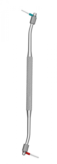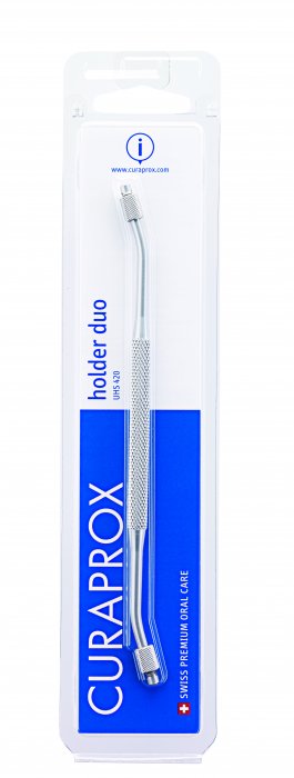 Profesionální držák mezizubních kartáčků z eloxovaného hliníku oboustranný v barvě stříbrné, který je určen pro bezpečné a praktické čištění mezizubních prostor, speciálně vhodný pro postranní úsek zubů. 1ks držáku UHS 420 v balení (blister).